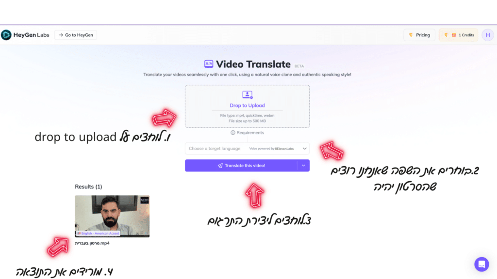 איך נרשמים? הולכים לכתובת הבאה ונרשמים ( שימו לב שנמצא באיזור labs זה אומר שעוד בפיתוח ) : https://labs.heygen.com/video-translate